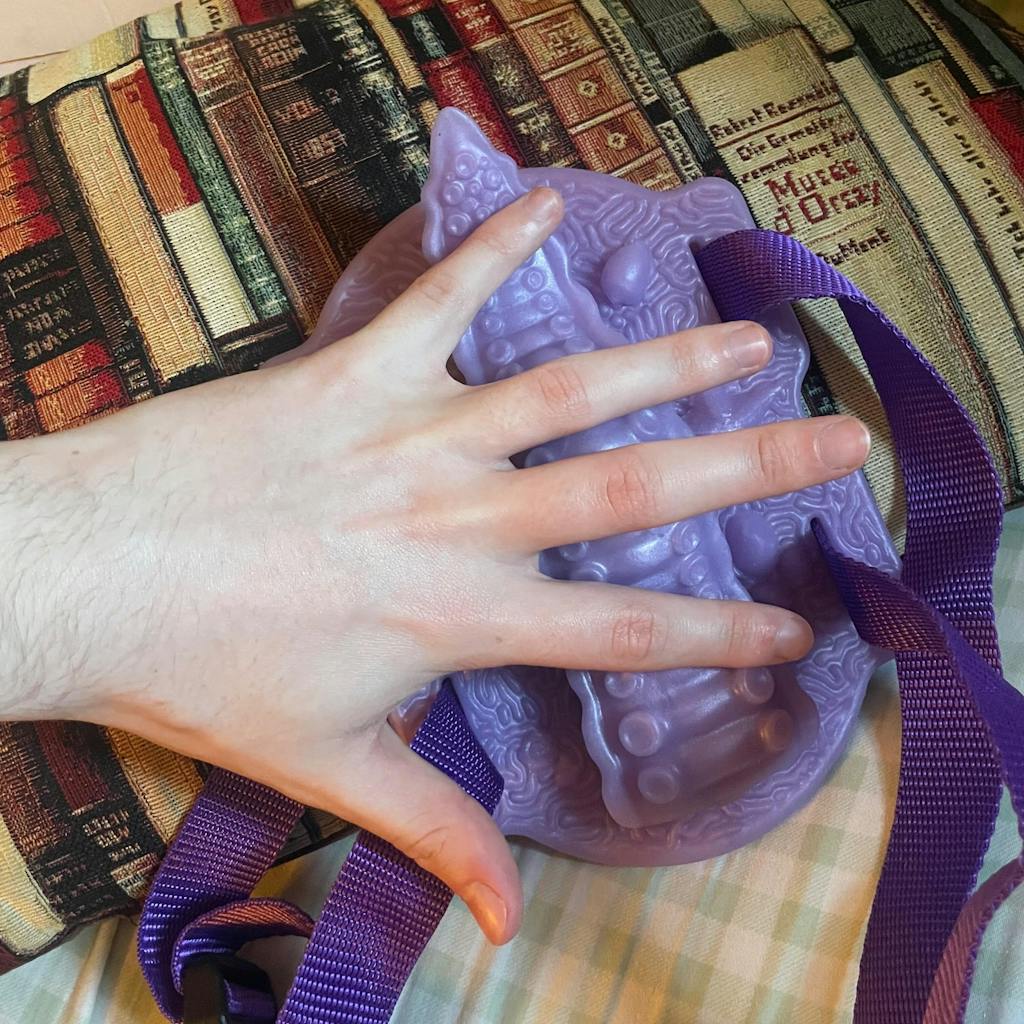 Jeder Tentacle Grinder wird mit zwei schwarzen Nylonbändern (je 1 m lang) mit Schnellverschlüssen geliefert, mit denen man ihn an einem Kissen, der Hand, dem Oberschenkel oder dem Unterarm befestigen und dann die ganze Nacht durchgrinden kann.