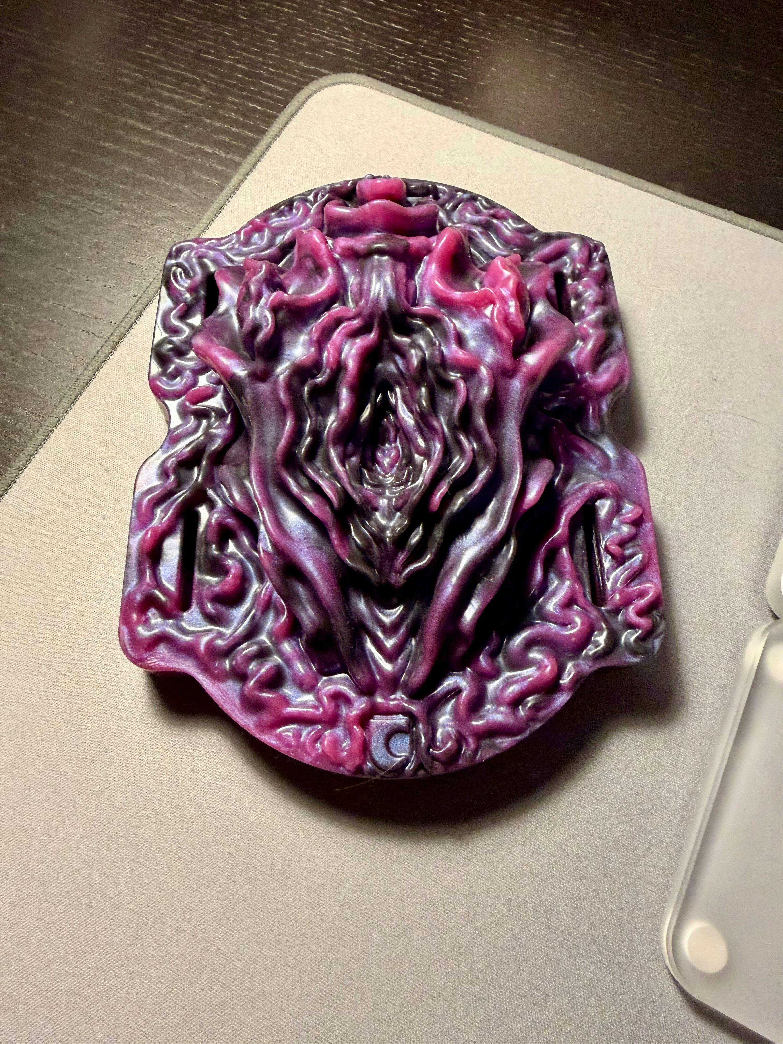 I feel like my phone camera doesn't do it justice, it's a lovely metallic purple-black-blue pour. Got it from the ready-made pile, super soft. It's covered in details all over, so there are lots of different angles to try. I thought it would be a hassle to clean because of all the crevices but it's actually fine. And it came with an adorable little mini-me in gold-dusted black!!!