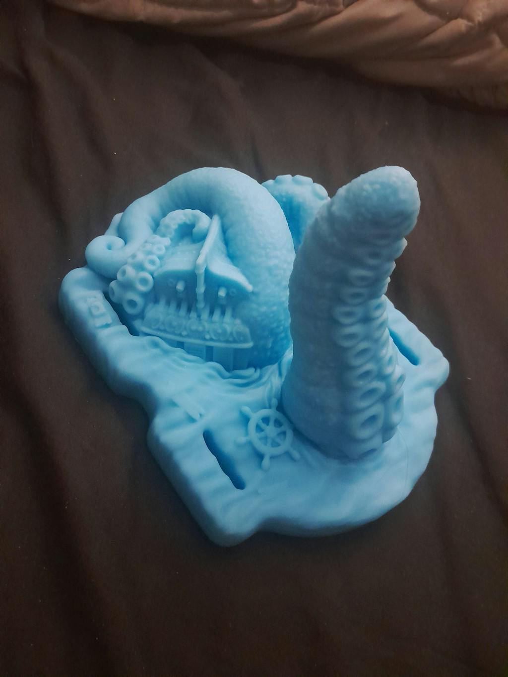 This sea monster scene is a true nautical nightmare. A mighty ship riddled with intricate details, being dragged beneath the waves by relentless tentacles. With each twist and coil, the Kraken sinks its prize, sending splintered beams and shattered dreams adrift.